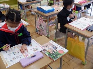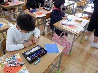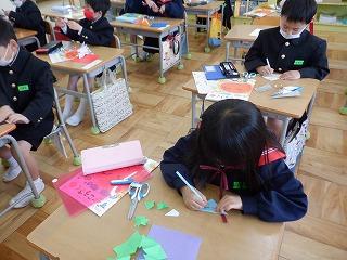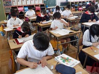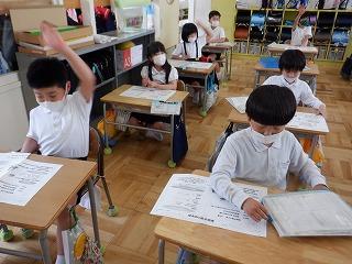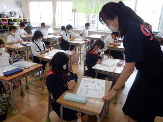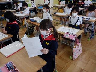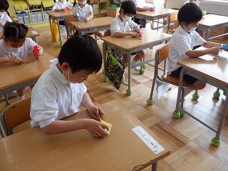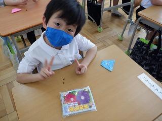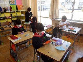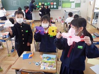 5月10日(火)1年2組の子ども達が、はさみを上手に使いながら飾りを作っていました。折ったり重ねたりした色紙を切ると、いろいろな形になることに驚きながら、作った飾りを友達や先生に見てもらい、楽しく取り組んでいました。