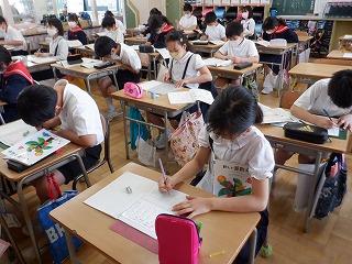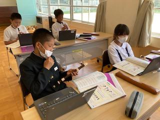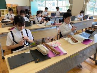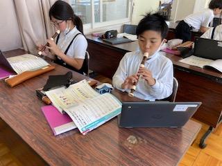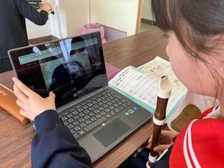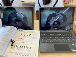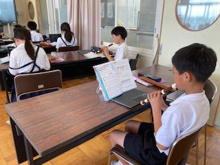 5月10日(火)5年2組の子ども達が、クロームブックを使ってリコーダーの指づかいを確認していました。担当の先生が演奏する動画を見ながら一緒に指を動かすことで、正しい指づかいを覚えることができます。コロナ対策で実際に吹く時間は減りましたが、いろいろな工夫をして取り組んでいますね。