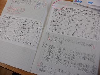 5月12日(木)4年2組の子ども達が、けが調べの資料を使って、資料を2つの観点から分類したり整理したりする方法について考えていました。実際に表に整理することで、分かることがたくさんあり、2次元表のよさを実感していました。