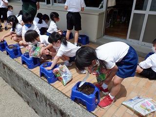 5月12日(木)1年1組の子ども達が、2年生からプレゼントしてもらった種と朝顔セットの種を使って、朝顔の種まきをしていました。先生の話を聞いて種を選び、植木鉢に土を入れて準備もしっかりしていました。きれいな朝顔の花が咲くよう、これから楽しみながら育ててくださいね!