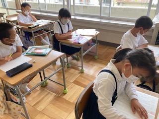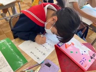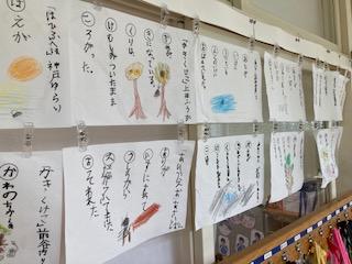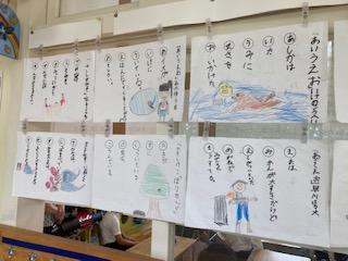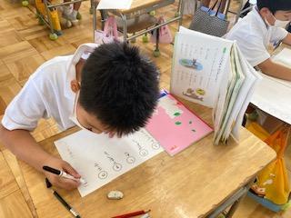 6日(水)2年生が、国語科の言葉遊びの学習で「あいうえお作文」にチャレンジしていました。自分で初めの文字を「あいうえお」や「あかさたな」に決めて、その文字に合う言葉を探しながら文を作っていました。子ども達は、語彙を豊かにするトレーニングをするかのように、一生懸命考えながら作っていました。