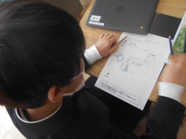 設計図には、題名と完成図・準備するもの、そして、工夫したところや利用した性質についての理科ポイントを書きました。子ども達は、クロームブックや本で調べながら設計図を一生懸命にかいていました。どんなおもちゃが完成するのか楽しみです!