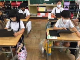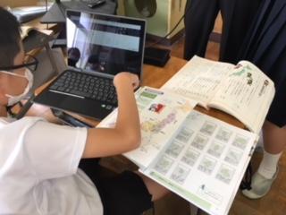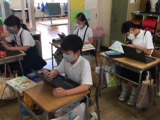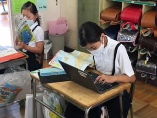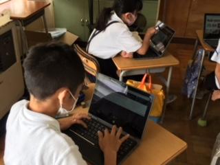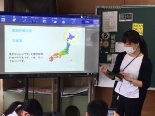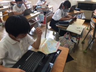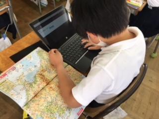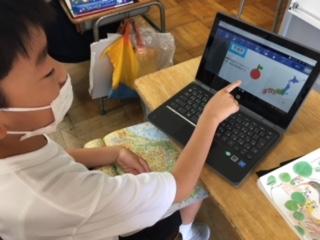 16日(水)4年1組の子ども達が、国語の教科書と社会の地図帳を開き、都道府県クイズを作っていました。自分が選んだ都道府県の名物や特産品をヒントに、県名を当てるクイズをクロームブックで作成し、みんなで共有するようです。国語科と社会科の学習をコラボして、県名を覚えながら楽しそうに作っていました。
