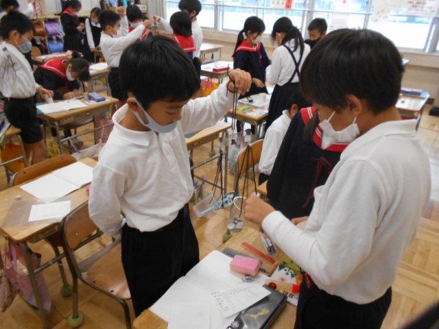 3年2組の子ども達は、今週から算数の時間に重さを調べる学習をしています。もとにするもの(1円玉)の数で表したり、重さを比べる時に自作の天秤でいろいろな物の重さ比べをしたりしました。