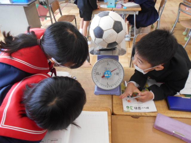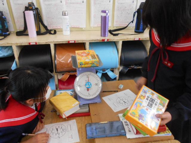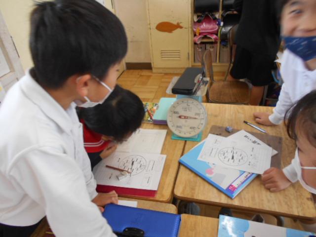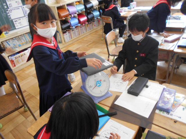 7日(火)の授業では、「はかり」を使って重い物の重さを量りました。初めて使うはかりにワクワクの子ども達。はかりの正しい使い方や目盛りの読み方を確認した後、どの子も身の回りの物の重さを進んで調べていました。