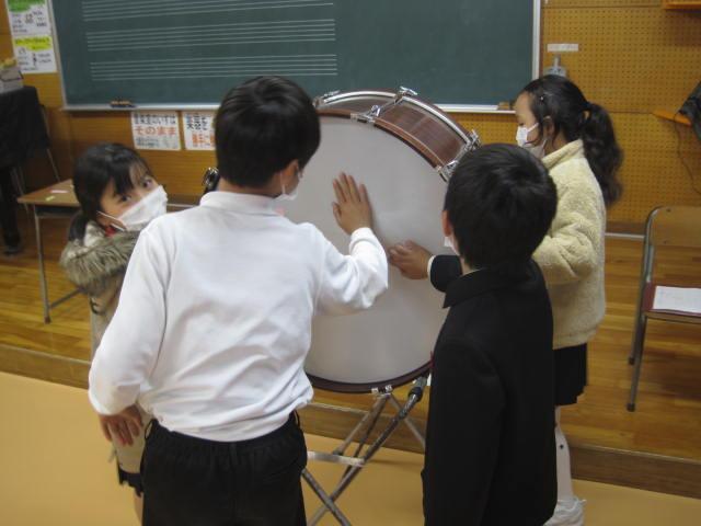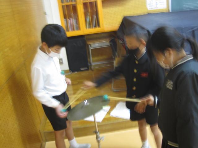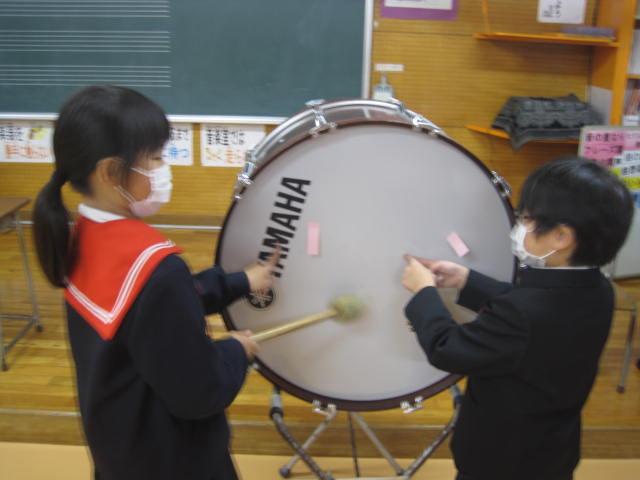 3年生の理科では、「音」についての学習が始まりました。身の回りには音を出す物がたくさんあります。授業では、音楽の授業で使うたいこやシンバル・トライアングル・タンバリンを使って、音を出した時に、その楽器がどんな様子なのかを調べることにしました。叩く強さを変えると楽器の様子が変わるのではないかと予想をし、調べる時は、触ったり付箋などを置いたりすると調べることができると考え、実験を開始しました。
