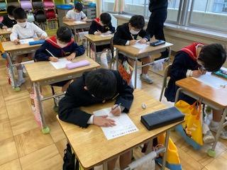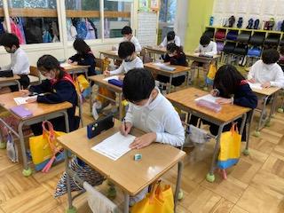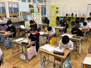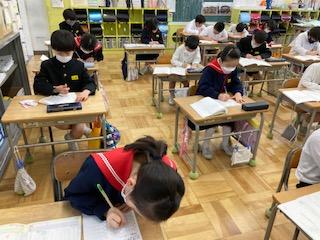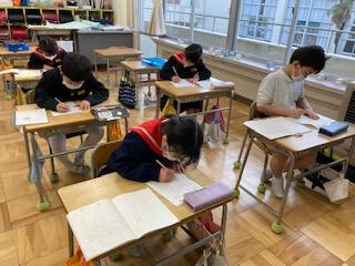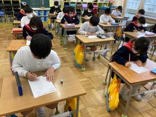 1月に実施した「校長先生九九検定」に全員合格した2年生。その力を確実にして3年生に進級できるようにと、2月は「校長先生九九テスト」に週2回挑戦しています。短い時間制限があるけれど、どの子も、満点目指して真剣な表情で取り組んでいます。