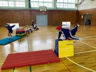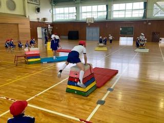 2月24日(金)1年生の子ども達が、とび箱・マット・平均台を使って運動遊びをしていました。自分たちでしっかり準備を整え、先生の指示を待つ姿からも1年生としての成長を感じます。