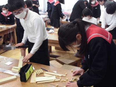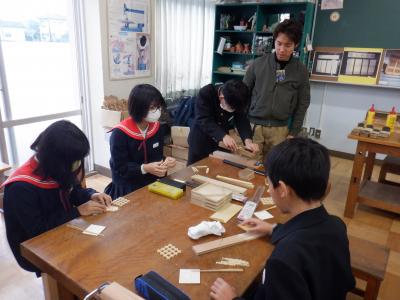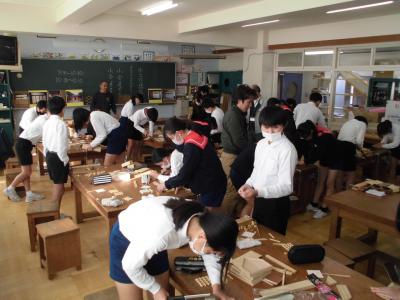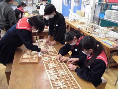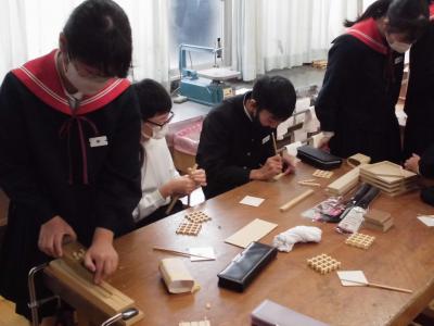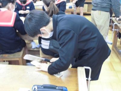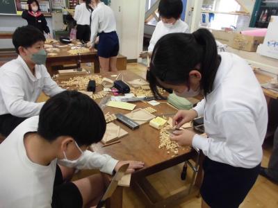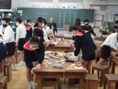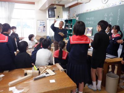 6年生 ものづくりマイスターから学ぶ 投稿日時 : 2023/11/30 chuuje 30日(金)、6年生は、ものづくりマイスターさんをお招きして「木工づくり講座」を行いました。 のこぎりを使ってパズルを作ったり、カンナを使って食事用の箸を作ったりしました。 ものづくりの楽しさとともに、難しさも感じることができました。 1組の様子です。 2組の様子です。 どちらのクラスも、個人での制作が終わった人から、欄間づくりにも挑戦しました。 教室と廊下の間の窓枠にはめ込んで、使うことができるそうです。いつでも眺められて、よい記念になりますね。 Tweet {{options.likeCount}} {{options.likeCount}}