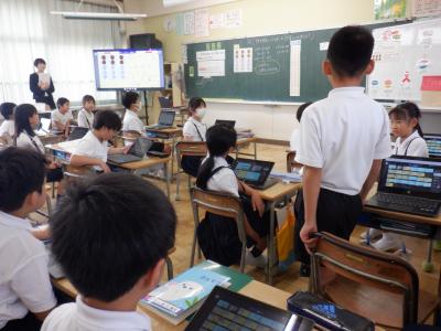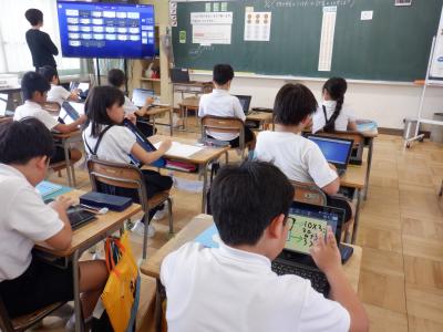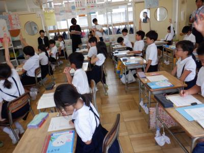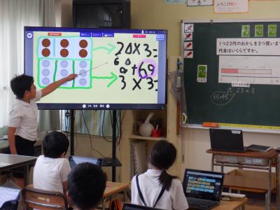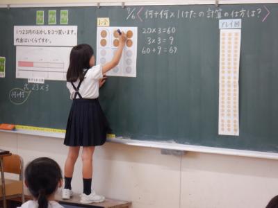 算数科の学習会 投稿日時 : 2023/09/06 chuuje 6日(水)、3年2組で算数科の研究授業を行いました。 <何十何×1桁の数の計算の仕方>を考え、説明できるようにすることがねらいの1時間です。 子どもたちは、自分の考え方を書いたり、進んで説明したりして、一所懸命に学び合いました。 他校の先生方も授業を参観されており、真剣に学ぶ姿を褒めてくださいました。 Tweet {{options.likeCount}} {{options.likeCount}}