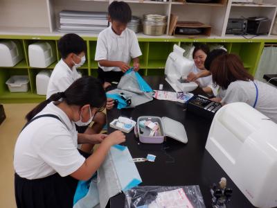 しつけ縫いをしてからミシンがけをしますが、久しぶりにミシンを使う子がほとんどです。