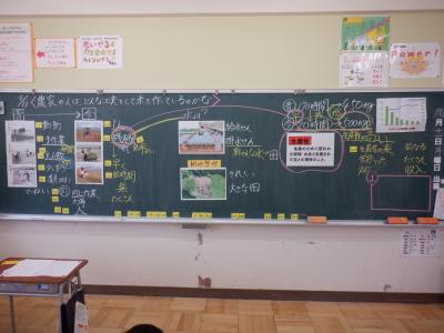 農家の人が、米作りの際にどんな工夫をしているのか、資料をもとに考え話し合っています。