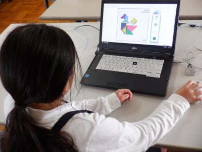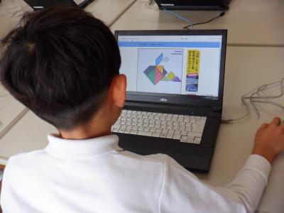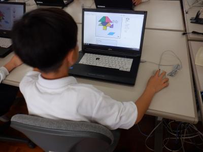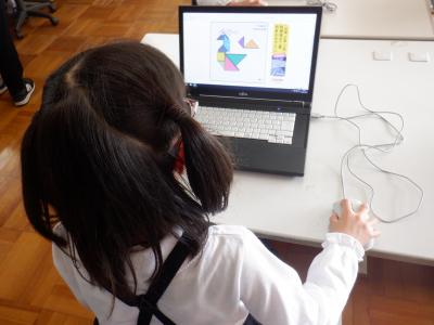 3年生は、かげ絵に指定された図形をあてはめる「タングラム」という教材を使って、学習をしました。