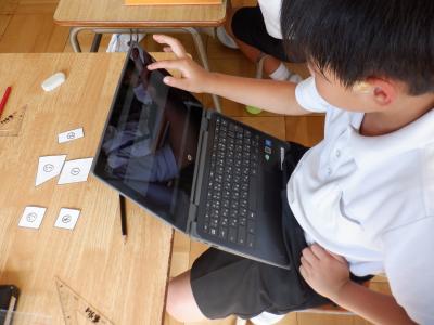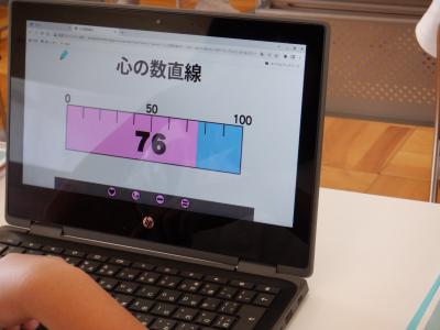 自分の思いを可視化するために、タブレットを使って「心の数直線」に思いを表したり、