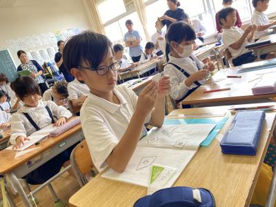 手元で図形を折り曲げたり、三角定規で直角を確かめたりしながら、真剣に考えることができました。