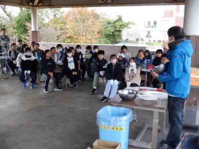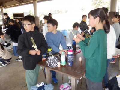 銀河の里キゴ山に到着して挨拶を交わした後は、さっそく「水バルーンロケット」の活動を行いました。