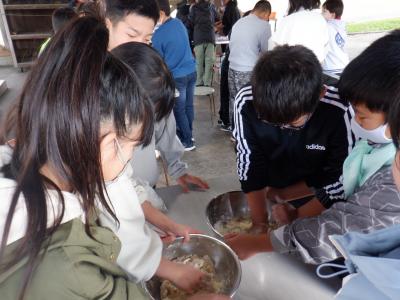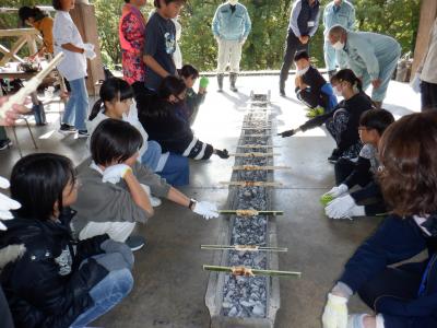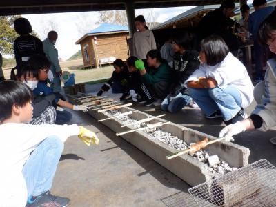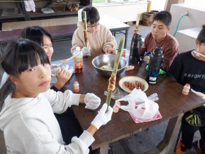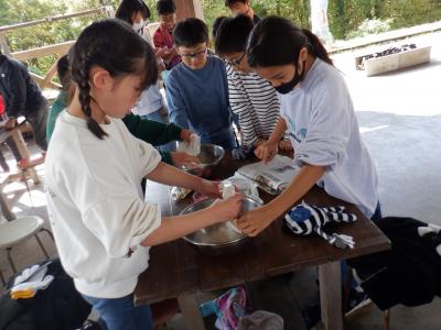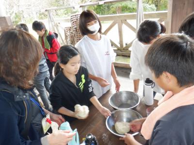 グループで協力してパン生地を作り、竹に巻き付けて炭火で焼きます。