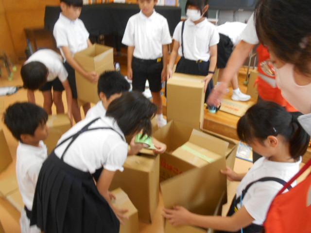 ↓ 段ボールベッドを実際に作る体験をしました。子供たちからは、「簡単に作れる!」
