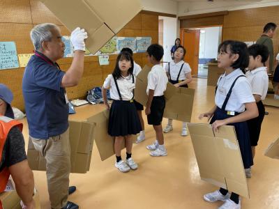 ↓ 段ボールベッドを実際に作る体験をしました。子供たちからは、「簡単に作れる!」