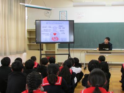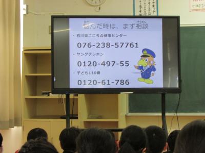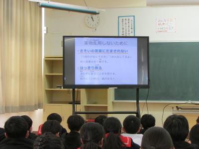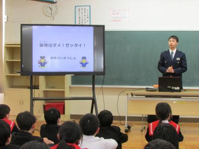 津幡警察署の警察官をお呼びして,薬物乱用防止教室を行いました。これから今までよりもさらに多くの人たちと関わることになる6年生に向けて,薬物に関する様々なことを教えていただきました。薬物乱用とはいったいどういうことか,薬物を使うとどうなってしまうのか,薬物乱用を防ぐにはどうするとよいのかといったことをクイズも交えながら分かりやすく説明していただきました。