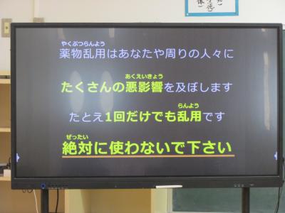 子供たちは,ネットでも簡単に薬物が手に入るようになり危険が身近にあること,薬物乱用しないためには誘いの言葉に騙されずにはっきりと断ることが大切だと学びました。また,一人で困ったことがあれば,お家の人や先生・警察・電話相談窓口といったところに相談することも大切です。