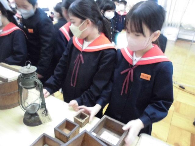 また,2月27日に見学に行く吉倉収蔵庫から,道具を一部持ってきてくださり,子供たちは使い方を予想したり質問したりしながら,手に取ってまじまじと見つめていました。