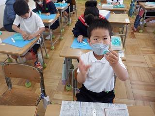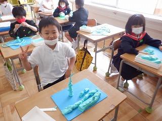 5月17日(火)1年2組の子ども達が、粘土を使って学習していました。この日の課題は、粘土をひも状にしながら表したいことを見付け、いろいろな形を工夫して作ることでした。1年生になって初めて使う粘土なので、硬くてひも状にするのは力がいる作業でしたが、どの子も楽しみながらいろいろな形を作って楽しんでいました。