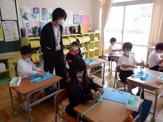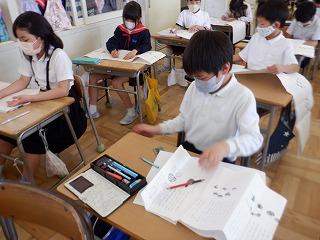 5月10日(火)1年2組の子ども達が、はさみを上手に使いながら飾りを作っていました。折ったり重ねたりした色紙を切ると、いろいろな形になることに驚きながら、作った飾りを友達や先生に見てもらい、楽しく取り組んでいました。