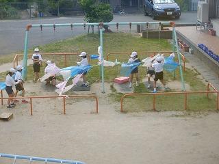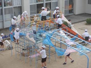 5月19日(木)3年1組の子ども達が、「つなぐ」をテーマに図工の学習をしていました。小運動場の遊具を使って、準備された材料を組み合わせたり結んだりつないだりして、手や体をいっぱい使って楽しく活動していました。