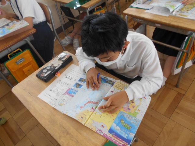 先週の社会の時間、5年生が資料を活用する力を確認する「確認小テスト」を行っていました。子ども達は、指定された地図帳のページを参考に「緯度と経度」「国や島の名前」「都市と都市の距離」などの問題を解いていました。