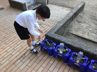 5月23日(月)1年生の子ども達が、登校後すぐに朝顔の水やりをしていました。種を植えてから毎日芽が出るのを楽しみに待っていたので、可愛い芽が出てきて、嬉しそうに水をあげていました。