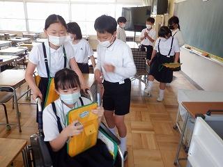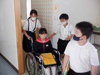 5月23日(月)5年生が、総合的な学習の時間に車いす体験をしていました。全員が体験できるように、グループに分かれて時間を図り、協力しながら活動していました。車いすに乗って学校中を移動してみることで、バリアフリーの必要性について実感していました。