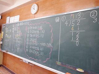 5月24日(火)4年2組の子ども達が、みんなで学んだわり筆算の方法を使って筆算問題に取り組んでいました。4年生になって初めて学習する筆算ですが、どの子も黒板に板書された一つ一つの手順をしっかりと確認しながら解いていました。