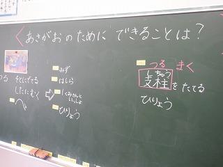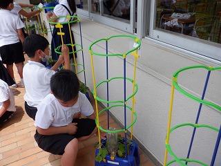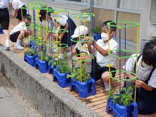 6月23日(木)1年2組の子ども達が、朝顔の鉢に支柱を立てていました。毎日水やりをして大事に育てている朝顔が、更に大きく育つようにと気持ちを込めて取り組んでいました。