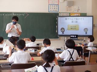 6月27日(月)3年2組の子ども達が、風で動く車を作り、うちわであおいで車を動かしていました。車を動かしてみて、気付いたことや疑問に思ったことを見つけようと、子ども達は一生懸命に取り組んでいました。