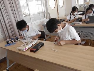 5年2組に引き続き、1組でも玉止めと玉結びの練習をしていました。初めての裁縫学習。子ども達は、集中して針に糸を通し、玉止め・玉結びの練習をしていました。