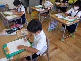 7月11日(月)1年1組の子ども達が、朝顔の花の観察をしていました。楽しみにしていた花が咲き、どの子も嬉しそうに描いていました。平仮名もたくさん書くことができるようになって、気づいた様子をどんどん書いている子もいました。