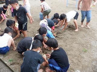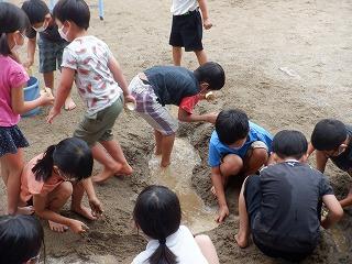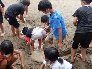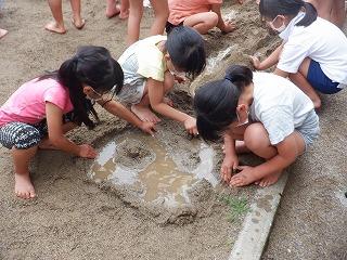 1学期末、1年生の図工「すなやつちとなかよし」の学習で、砂遊びをしました。子どもたちは、友達と穴を掘ったり山をつくったり、水を流して川のようにしたりと、みんなで仲良く活動しました。思う存分服を汚して楽しんでいる子もいました。保護者の皆様、汚れてもいい服を準備していただきありがとうございました。