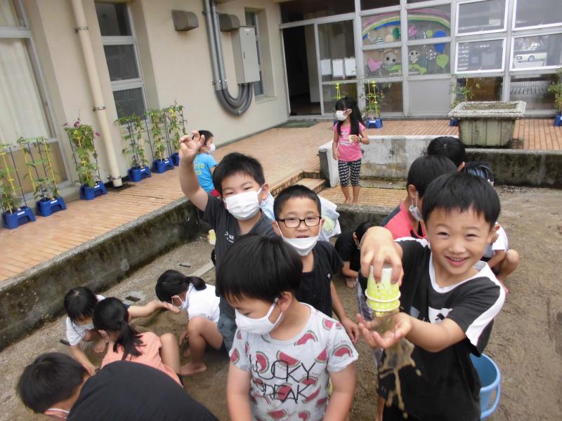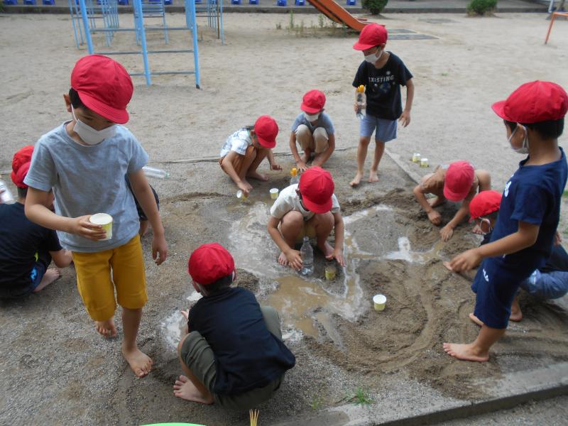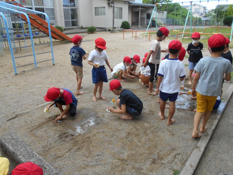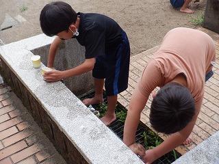 7月20日(水)1年2組の子ども達が、生活科の「みんなで あそぼう」の学習で、水遊びをしていました。小運動場の砂場に水を運び、1学期最後の学習をみんなで仲良く楽しんでいました。