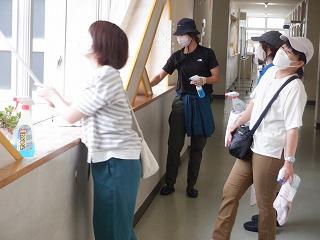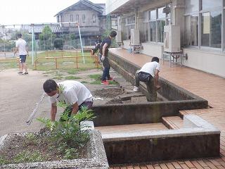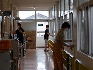 8月28日(日)5・6年生児童と保護者による環境美化清掃が行われました。早朝から、保護者の皆様には、校舎回りと校内に分かれて作業いただきました。
