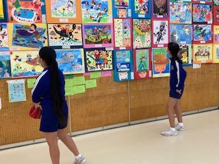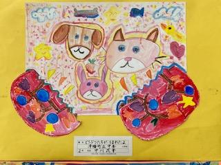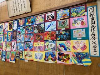 12月21日(水)22日(木)の両日、本校プレールームで、河北郡市小学校低学年各校代表児童の図画作品が展示されています。どの作品も、子供らしいアイディアあふれる作品ばかりで、子ども達は楽しみながらじっくりと鑑賞していました。