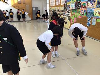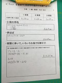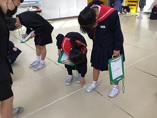 12月21日(水)5年生が、算数の時間にプレールームを使い、一人一人10歩ずつ歩いて距離を測り、平均値を歩幅として求めていました。子ども達は、グループで協力し合って測定し、それぞれの歩幅を比べながら楽しく学び合っていました。体験と実感を伴う学習は、きっと忘れませんね!