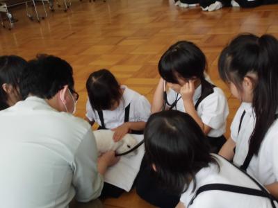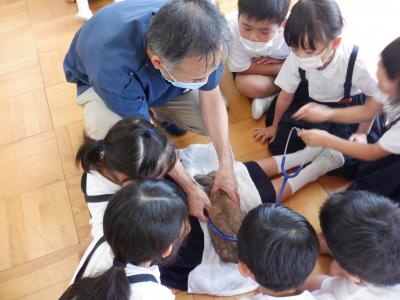 小グループに分かれて、うさぎを抱いてぬくもりを感じたり、聴診器で心音を聞いたりして、