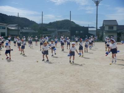 1,2年生は、小道具のカラフルなミニポンポンを持って、曲に合わせて練習です。