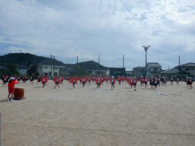3,4年生は、当日着用する法被を身に付けて、入場から演技そして退場まで通して練習です。