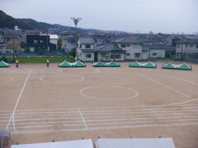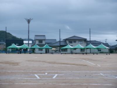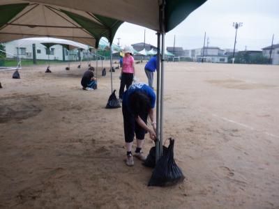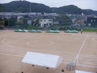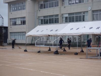 放課後は雨の中、先生方でテントを立てたり、ラインを引き直したりしました。