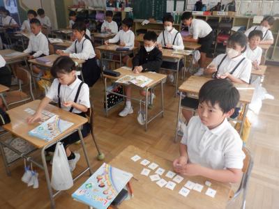 自分の机上に並べたカードの中から、アレックスさんが言ったアルファベットカードを選んでいました。