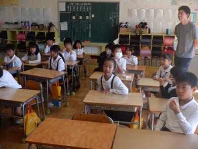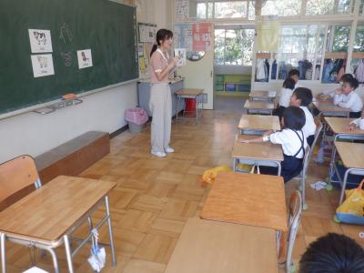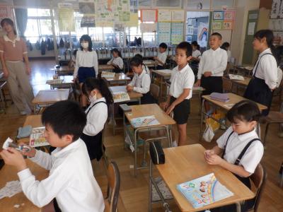 4年生が、ALTのアレックスさんとアルファベットの学習をしています。