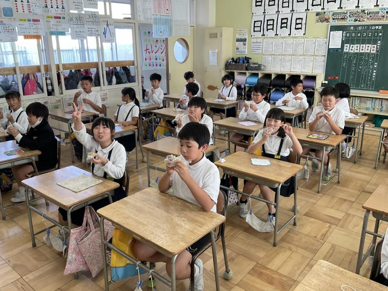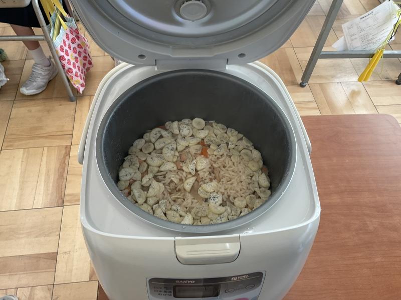 10月24日(火)6限目には、収穫したまこもを炊き込みご飯にしていただきました。子どもたちは「食感がコリコリしていた」や「みずみずしくて美味しかった」と感想を伝え合っていました。