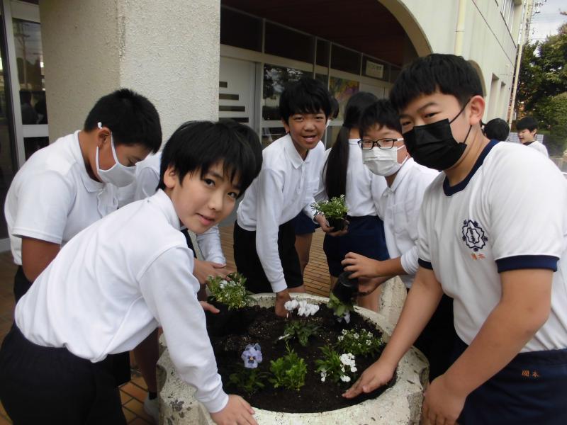 10月30日(月)昼休みに、環境委員会の児童が、児童玄関前の花壇に花の苗を植えました。